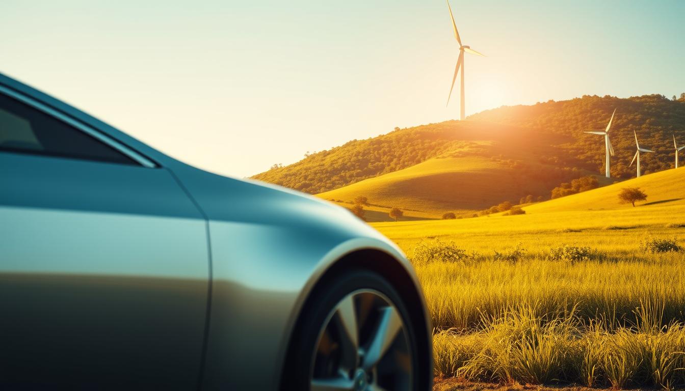 Hydrogen transport: a sleek, futuristic hydrogen-powered vehicle glides through a modern cityscape, its clean exhaust emission-free. The foreground showcases the vehicle's aerodynamic design, with a smooth, metallic chassis and advanced lighting systems. In the middle ground, bustling streets lined with tall, glass-clad skyscrapers create an urban environment powered by sustainable energy sources. The background features a clear, blue sky, with a warm, golden hue from the sun, conveying a sense of progress and innovation in the field of hydrogen-based transportation. Crisp, high-resolution photographic quality, with attention to detail and realistic lighting.